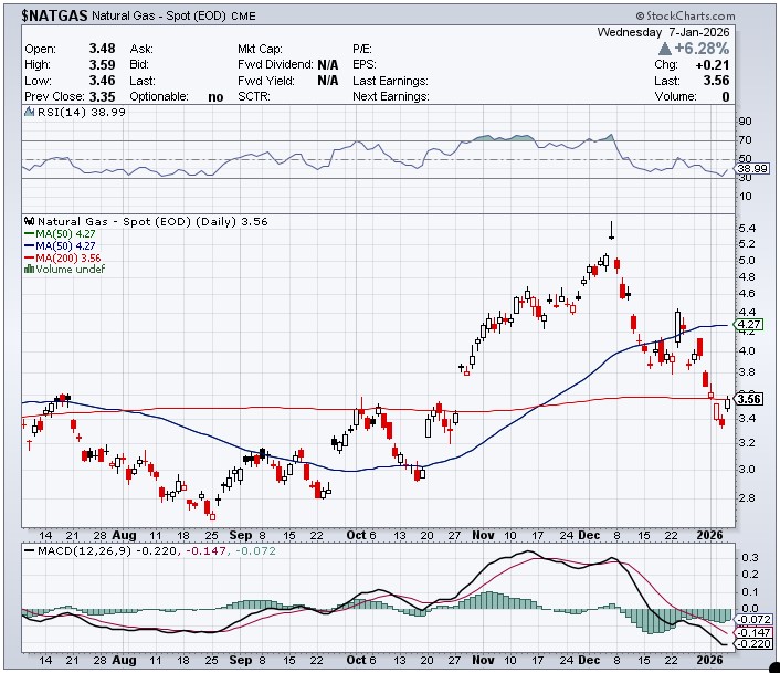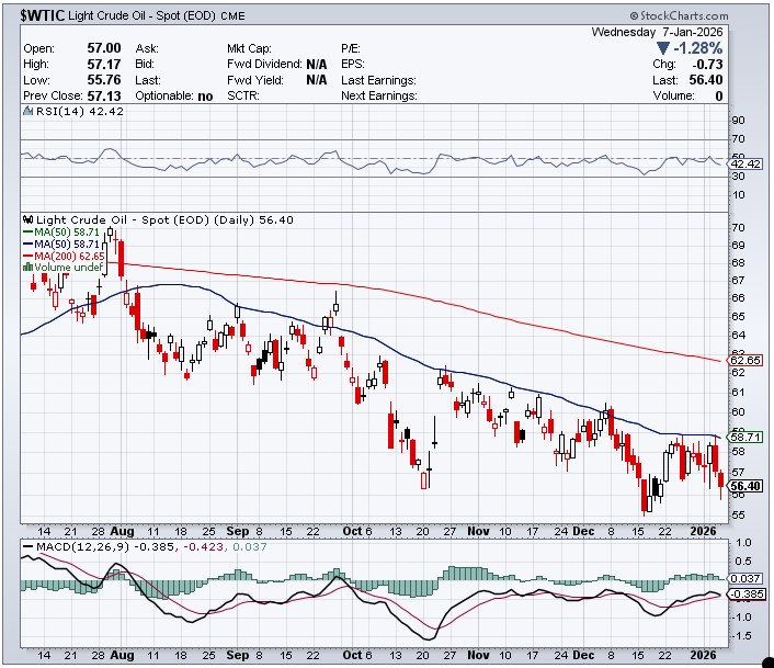 Natural gas [chart included] caught a bid yesterday…closing up 21 cents/6.28% at $3.56/1,000 cubic feet — and managed to poke its nose above its 200-day moving average intraday on Wednesday. WTIC took another big hit, as it was closed down a further 73 cents at $56.40/barrel — and was below 56 bucks intraday yesterday.