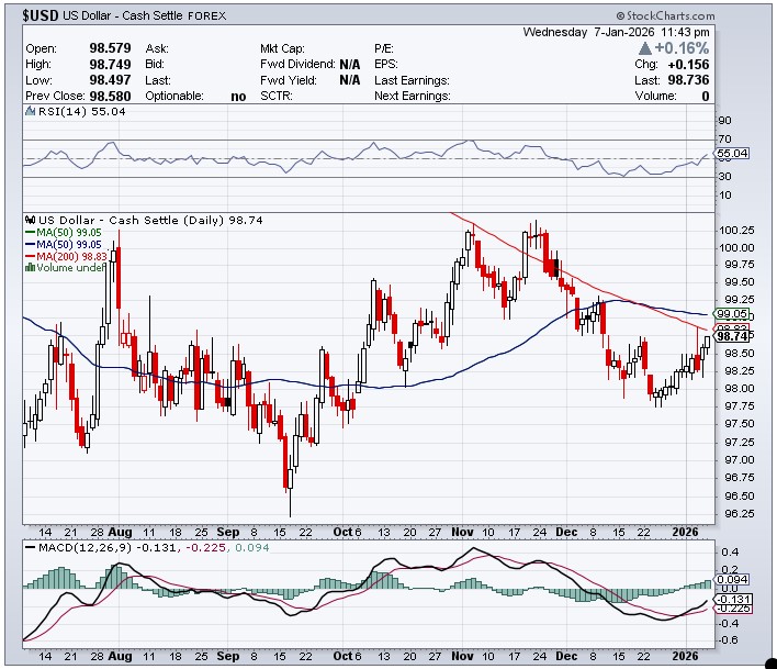 Here’s the 6-month U.S. dollar index chart…courtesy of stockcharts.com as always. The delta between its close…98.74…and the close on DXY chart above, was 6 basis points above that. The rally in the dollar index that began around Christmas is now coming close to breaking above its 200-day moving average…as you can see from this chart. I’ll have a bit more in this in The Wrap. Click to enlarge.