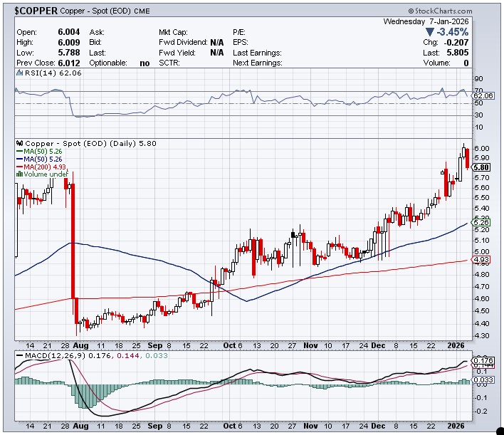 Copper’s sojourn above $6 was fleeting, as it got engineered lower by 20.7 cents/ 3.45% — and was closed at $5.80/pound…taking back all of Tuesday’s gain, plus half of Monday’s in the process.