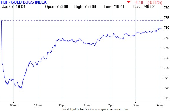 Not surprisingly, the gold shares gapped down at the 9:30 opens of the equity markets in New York on Wednesday morning — and then kept on going lower until 10:15 a.m. EST. They then rallied impressively [along with the gold price] until ‘da boyz’ stepped on gold’s rally at 11:45 a.m. They then drifted a bit lower until 1:15 p.m. when gold bottomed out — and then crawled quietly higher until the markets closed at 4:00 p.m. EST. The HUI closed down only 0.55 percent.