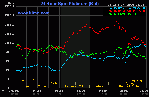 After platinum’s 6:28 p.m. EST high tick on Tuesday evening in New York, it was pretty much ‘lights out’ until the collusive commercial traders of whatever stripe/ ‘da boy’ also set its low tick around 10:15 a.m. in COMEX trading in New York on Wednesday morning. Like for silver, its ensuing rally was also capped and turned lower at exactly noon EST — and its price path after that was managed the same as silver’s as well…right up until the market closed at 5:00 p.m. EST. Platinum was closed at $2,300 on the button…down $137 on the day — and 61 bucks off its Kitco-recorded low tick.